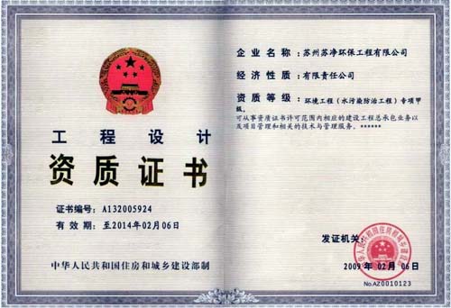 日前,公司控股子公司江蘇蘇凈集團(tuán)下屬的蘇凈環(huán)保工程有限公司榮獲了由國家住房和城鄉(xiāng)建設(shè)部頒發(fā)的環(huán)境工程(水污染防治工程)專項甲級資質(zhì)。