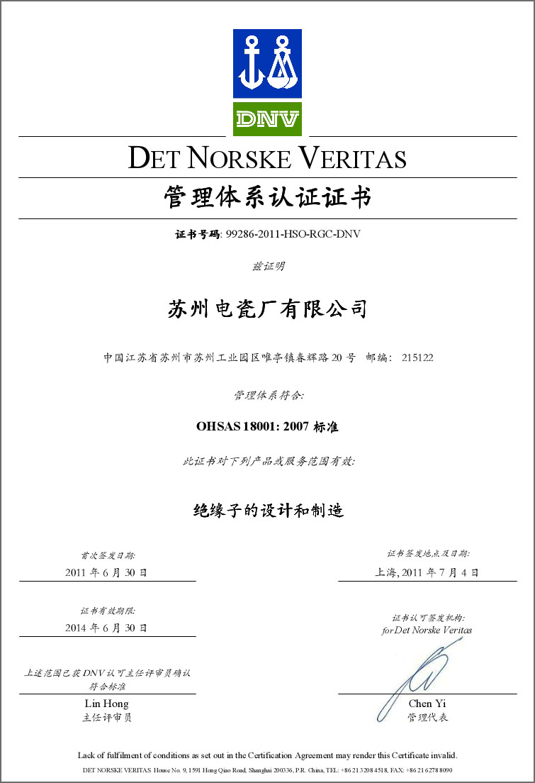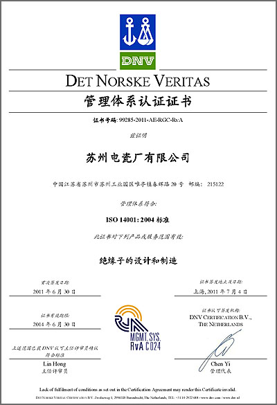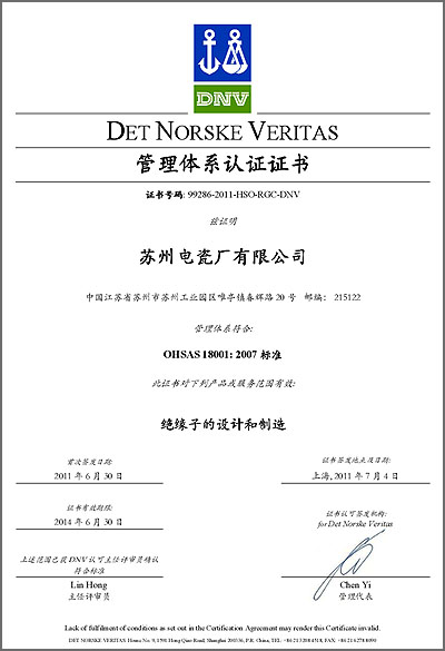 最近,公司控股子公司蘇州電瓷廠有限公司通過了挪威船級社(DNV)頒發(fā)的兩項管理體系認(rèn)證:分別是ISO14001:2004環(huán)境管理體系認(rèn)證,和OHSAS18001:2007職業(yè)健康及安全管理體系認(rèn)證。